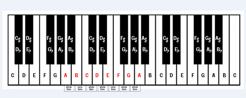 The red notes indicate the notes played in the scale. Notice that no black notes are played (C major has no sharps or flats), and the whole tones are always between the white notes which have a black note between them. The semitones are between the white notes which do not have a black note between them.