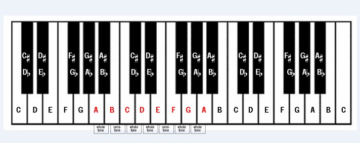 Using the key of a minor, which has no sharps or flats in its key signature, we’ll look at and listen to the natural minor scale first. The sequence of intervals is as follows: