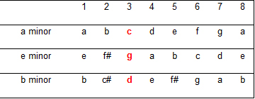 The next table shows the three natural minor scales related to the major scales above. This time, you’ll notice that the bold print red note, which is the root note of the relative major key, has changed to the third step.