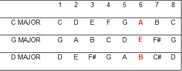 But let’s forget that confusing fact for a moment and look at how major scales and minor scales relate to each other.  Every key signature relates to both a major key and a minor key. The table below shows 3 ascending major scales. The numbers above the scales relate to the steps of the scales.  The red note in bold print in each scale is the root note of the relative minor.